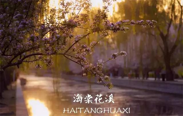 “海棠花溪”景区位于原熊猫环岛东侧,景区内种植了西府海棠、贴梗海棠、金星海棠、垂丝海棠等诸多品种的海棠树近2000株,是城区内最大的海棠林。