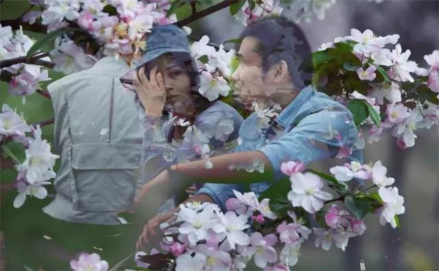 春花盛开,怎么少的了成对的恋人,小伙子带着恋人也穿行在花海里,一对对的相互的依偎着。用了多重曝光把热恋中的一对情侣放置在了海棠花的海洋里。