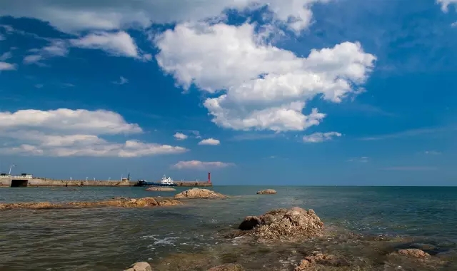辽宁绥中蓝天白云的觉华岛港口