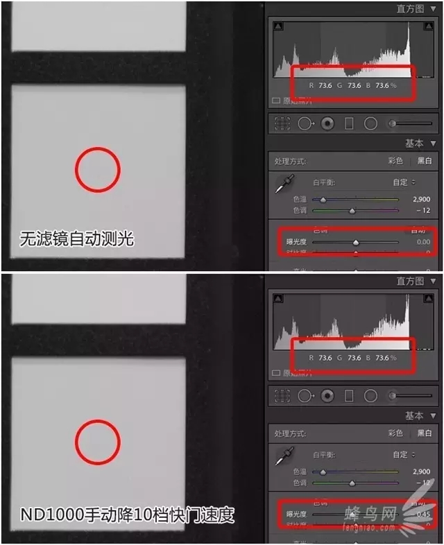 从实际拍摄的感受来讲,这块天利ND1000的实际减光效果并没有达到10档,可以看出,右侧使用ND1000然后手动降低10档快门速度之后,画面要比左侧未加滤镜稍稍亮一些,通过室内严谨测试来看,这款ND1000的实际减光效果大概在9.55档左右: